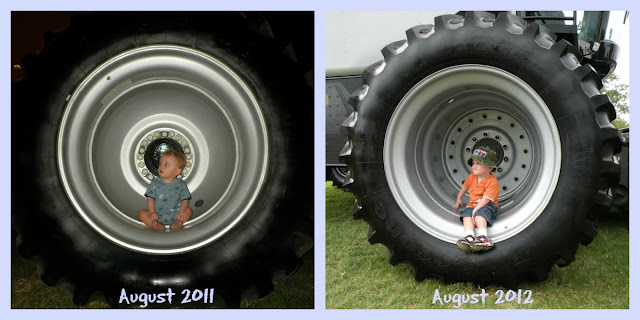 Dakota and I spent a good amount of time looking at tractors at the DuQuoin State Fair this past weekend. He walked around from tractor to tractor, in complete little boy heaven. He would climb up on the little ones. Point and say "Up" for the medium-sized ones. Stop dead in his tracks and yell, "Whoa!" or "Wow!" for the really big ones. I think I had just as much fun as he did, and it quickly became Aunt Manda heaven, too. :)